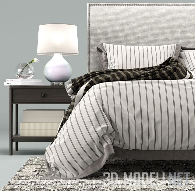 Двуспальная кровать от бренда Crate&Barrel, коллекция Cole. В наборе постельное белье с подушками, тумбы с настольными лампами, декоративные элементы.