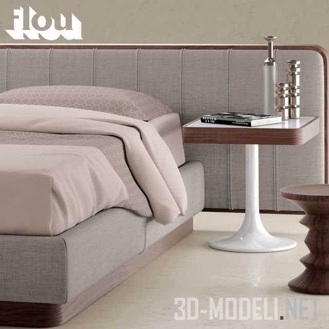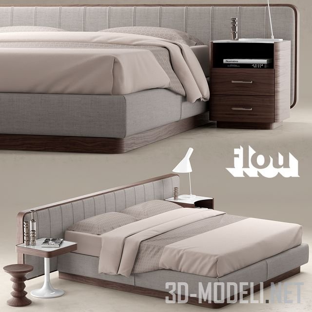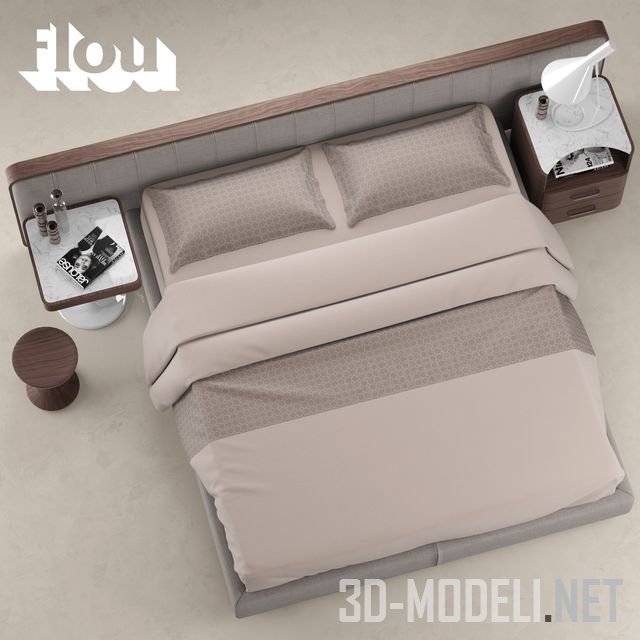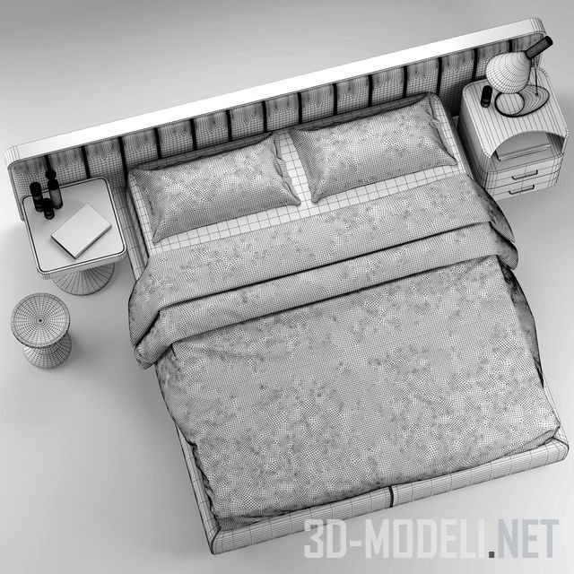 Высокого качества 3d модель современной спальной мебельной группы, в основе которой кровать Ermes от итальянского производителя Flou. В комплекте присутствует все необходимое: прикроватные тумба и столики, настольный светильник, постельное белье с подушками, декоративные предметы.