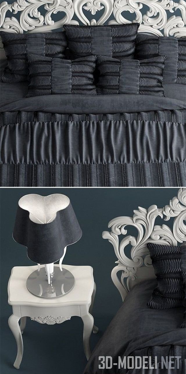 Роскошная кровать с резным изголовьем, модель MEMORIE VENEZIANE от Giorgio Casa. В комплекте прикроватная тумбочка и настольная лампа. Сочетание черного и белого делает набор очень элегантным.