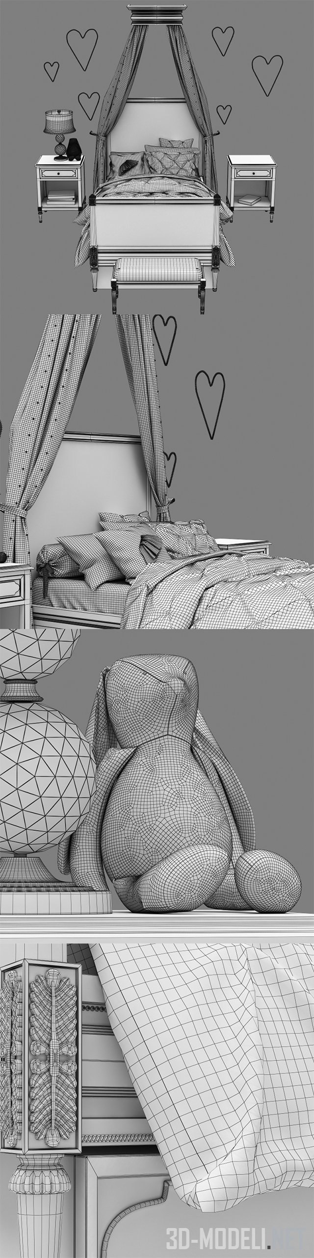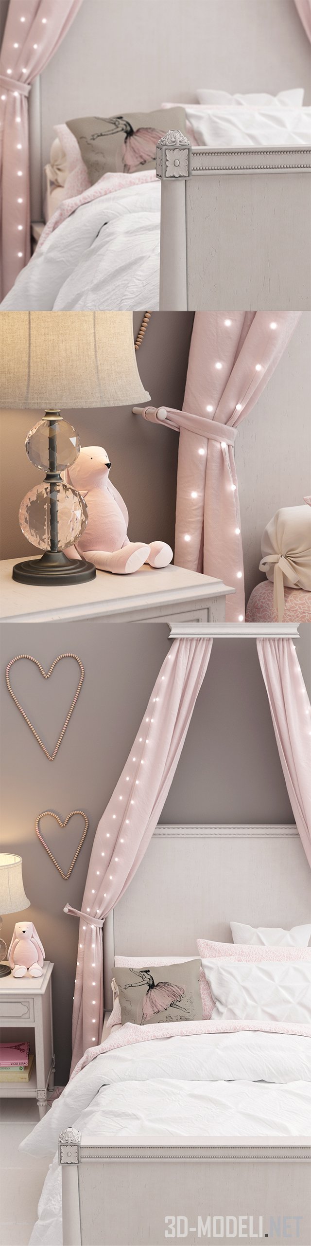 Нежный и романтичный набор мебели и аксессуаров для детской комнаты, с кроватью Restoration Hardware Baby & Child, модель Bellina. В комплекте есть все, чтобы создать невероятно уютное пространство – кровать дополнена балдахином, постельным бельем и подушками. Присутствуют прикроватные тумбочки, с книгами и настольными лампами, игрушки, банкетка с меховой накидкой. Стены украшены декоративными сердцами.