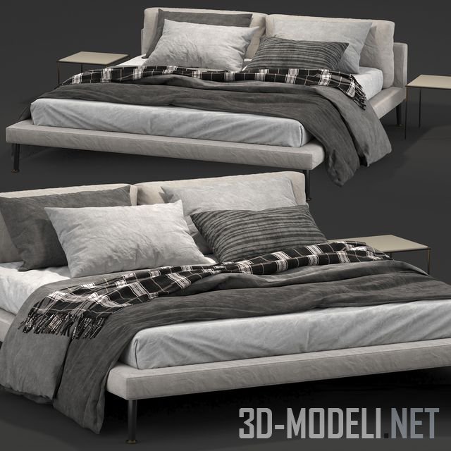 Высокодетальная и реалистичная 3d модель двуспальной кровати в современном стиле, Floyd-Hi от Living Divani. Кровать с постельным бельем и подушками. Клетчатый плед создает очень уютную атмосферу. Размеры кровати: 220 х 240 х 84 см.