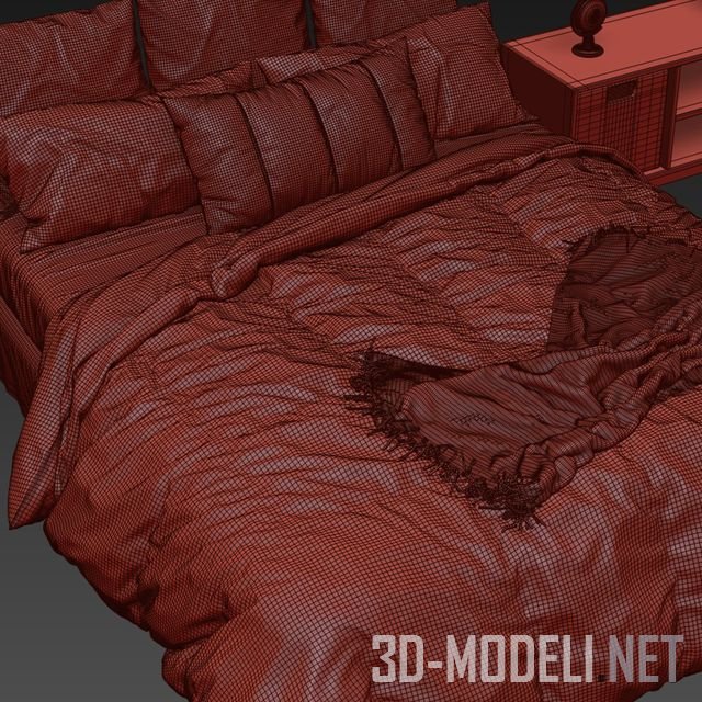 Двуспальная кровать, качественная трехмерная модель для интерьера спальни. Набор отличает мягкая и гармоничная цветовая гамма – пышное одеяло светло-серого цвета хорошо сочетается с бежевыми и розовыми подушками. Тумбы из светлого дерева идеально дополняют кровать. Настольная лампа, чашка и растение вносят свою долю реализма и уюта.