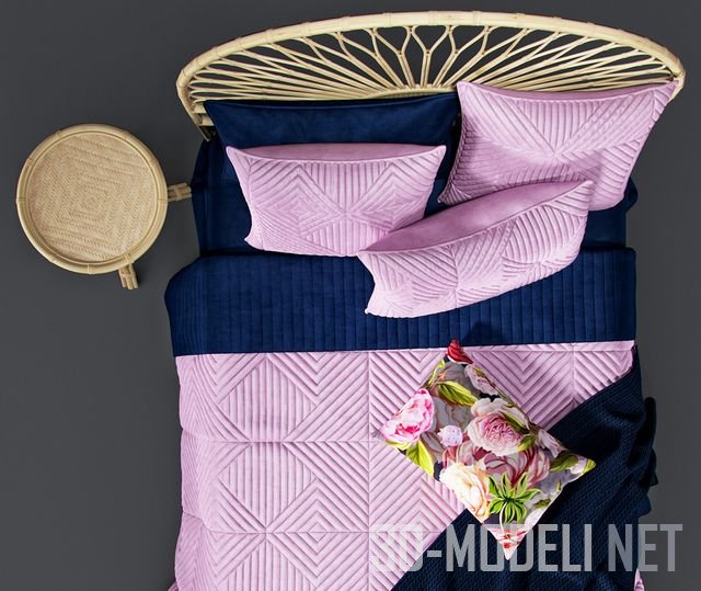 Акцентом композиции является красивое мягкое бархатное стеганое одеяло с модернизированным угловым орнаментом Newport Quilted Velvet. Это идеальное сочетание шика, роскоши и элегантности. Подушка с цветочным принтом отлично вписывается в цветовую гамму набора.