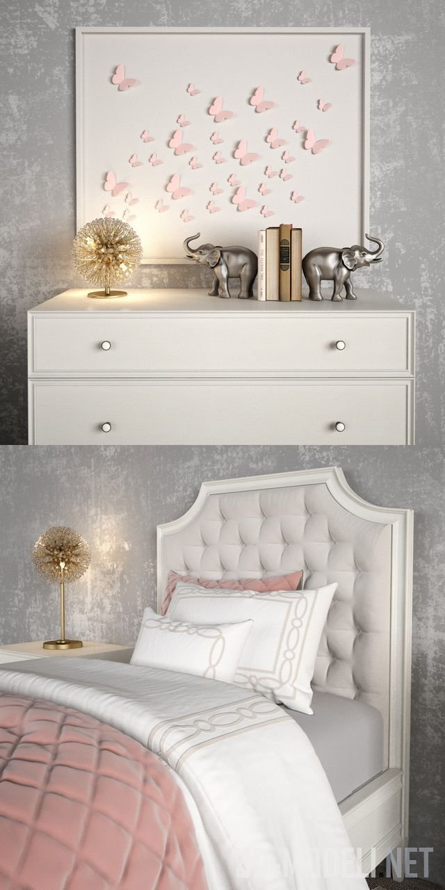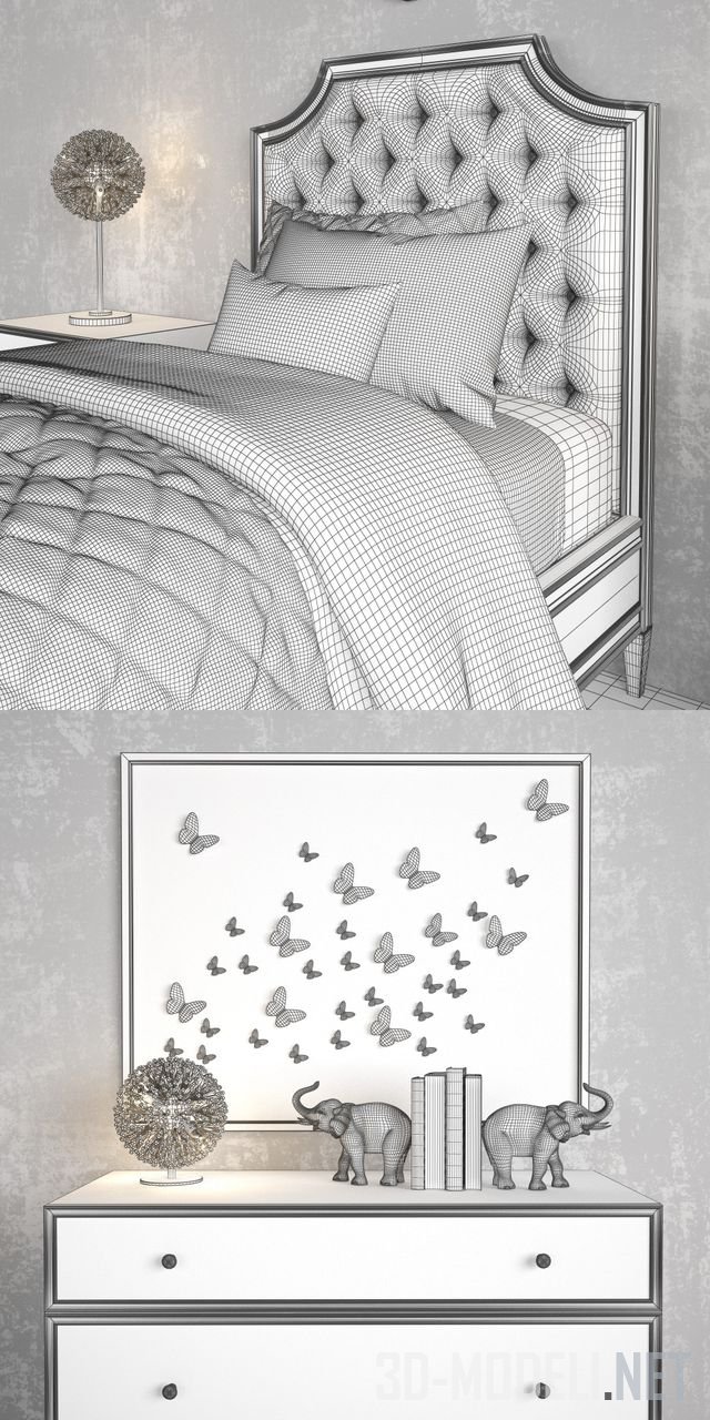 Большой серый ковер с белым геометрическим рисунком отлично оттеняет белую детскую кровать Alexandra. Кровать с мягким стеганым изголовьем, белым и розовым постельным бельем. В наборе две тумбочки со светильниками и белое квадратное панно с бумажными бабочками.