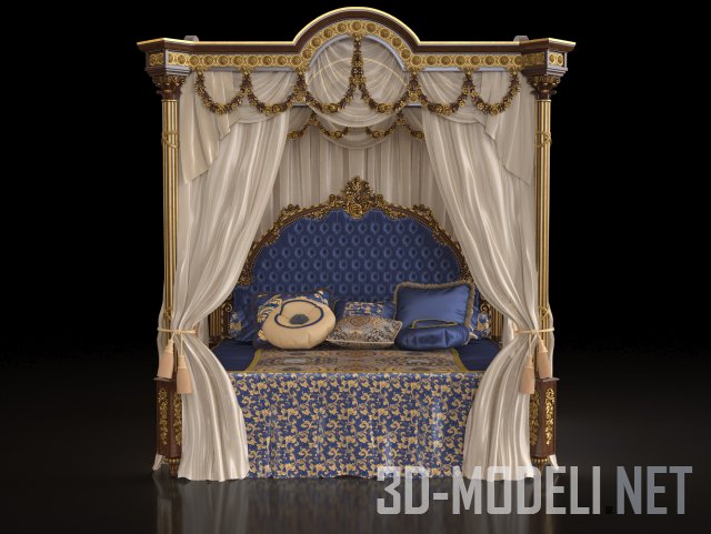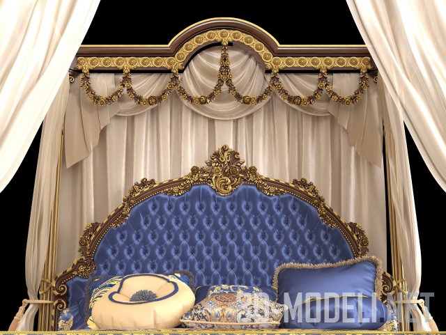 Роскошное ложе, двуспальная кровать от итальянского Modenese Gastone. Столбики для кровати и верхняя часть конструкции, а также обрамление изголовья украшены резьбой и инкрустацией, что в сочетании с золотым цветом отделки создает царственную, богатую атмосферу. Балдахин бежевого оттенка и постельное белье в благородных голубых тонах идеально вписываются в комплект.