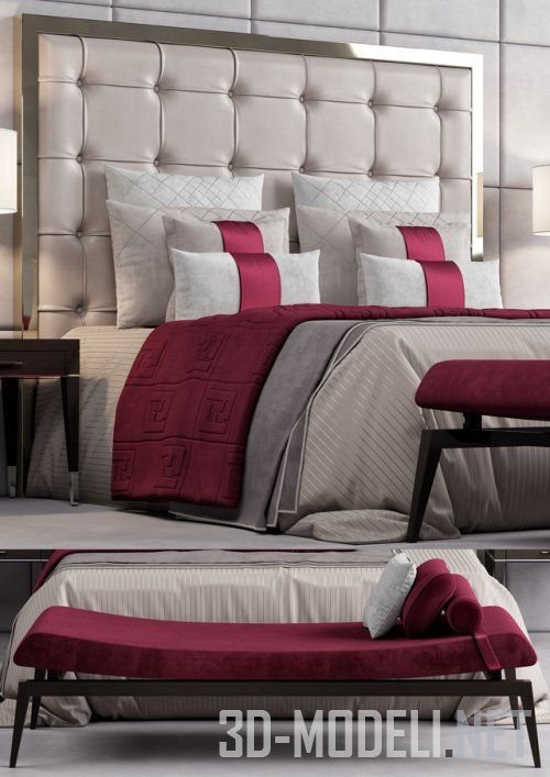 Большая двуспальная кровать Savile от бренда Fendi Casa. Кровать с высоким мягким изголовьем, простеганным декоративными квадратами и белым с шелковой бордовой отделкой постельным бельем. С двух сторон кровати стоят одинаковые столики с белыми настольными лампами, также в комплекте большая бордовая кушетка с подушкой-валиком.