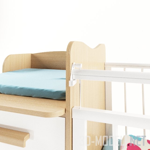 Функциональная детская кроватка ATON. Выполнена из светлого дерева, с выдвижными большими ящиками внизу. Кровать в комплекте с пеленальным столиком, с тремя выдвижными ящиками под ним.
