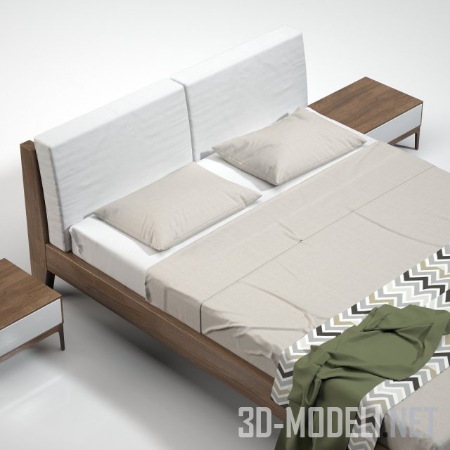 Двуспальная кровать Mikkel от бренда Rove Concepts. Кровать сделана в стиле простого образца датского дизайна. Изготовлена из прекрасно отполированного шпона вяза, с подушками в изголовье. Белое постельное белье с двумя цветными пледами прекрасно гармонирует с тумбочками в цвет кровати и белыми фасадами ящиков.