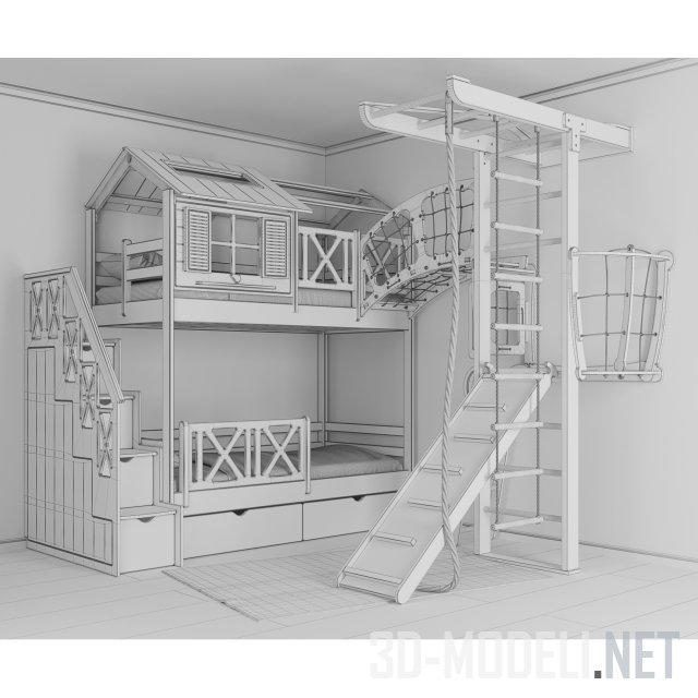 Двойная кровать в комплекте с развлекательно-спортивным комплексом (горка, лесенка, мостик и пр.). Нижняя кровать обычная, спальное место верхнего яруса оформлено в виде домика.