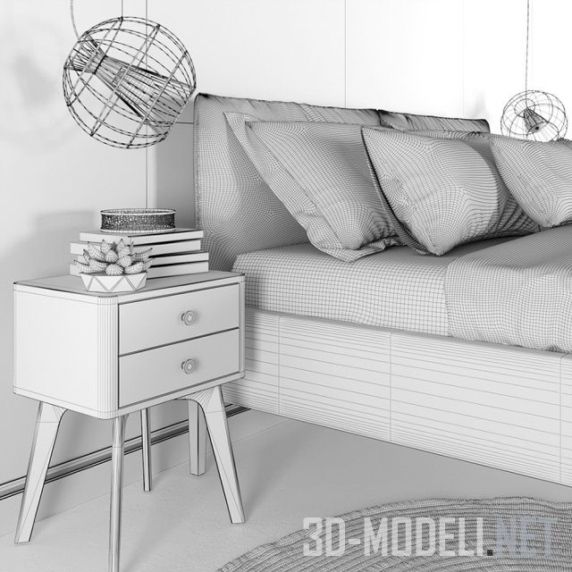 Спальный гарнитур в стильных тонах серого и графитового цвета. В наборе присутствует двуспальная кровать от MissoniHome, коллекция Adar, два пуфа на ножках из светлого дерева с кожаным, простеганным квадратами сиденьем темно-графитового цвета, Knut Bendik Humlevik, Rune Krojgaard из коллекции Mammoth от NORR11, две прикроватные тумбочки с двумя ящиками (RUBUS WITH TWO BOXES. MKRO) и два подвесных светильника Lussole Lgo. Lussole.