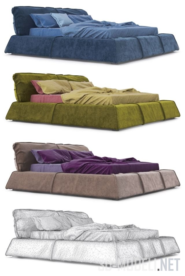 Большая двуспальная и очень уютная кровать Paris от Baxter. Кровать представлена в отделке нубуком в трех вариантах: синий, зеленый и светло-коричневый. На кровати лежит постельное белье «Midnight» (7 вариантов). Размеры кровати: 2250 мм х 2550 мм х 920 мм.