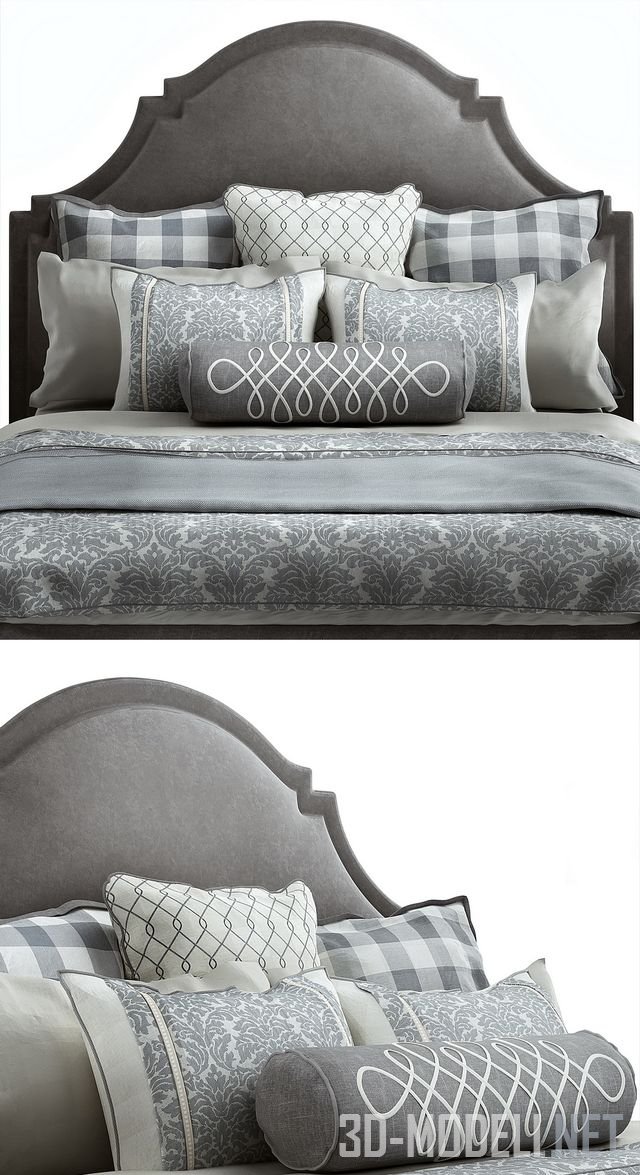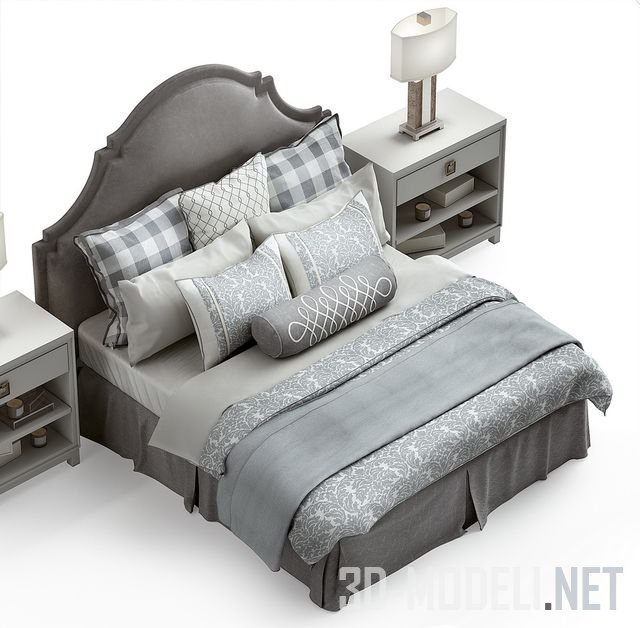 Двуспальная большая кровать Hickory White Bella от дизайнера Lillian August. Кровать с фигурной спинкой в классическом стиле и множеством подушек. Возле кровати с обеих сторон стоят прикроватные тумбочки Clifford LA99561 голубовато-серого цвета в тон спинки кровати, на которых находятся настольные лампы Uttermost Bonea 26508-1.