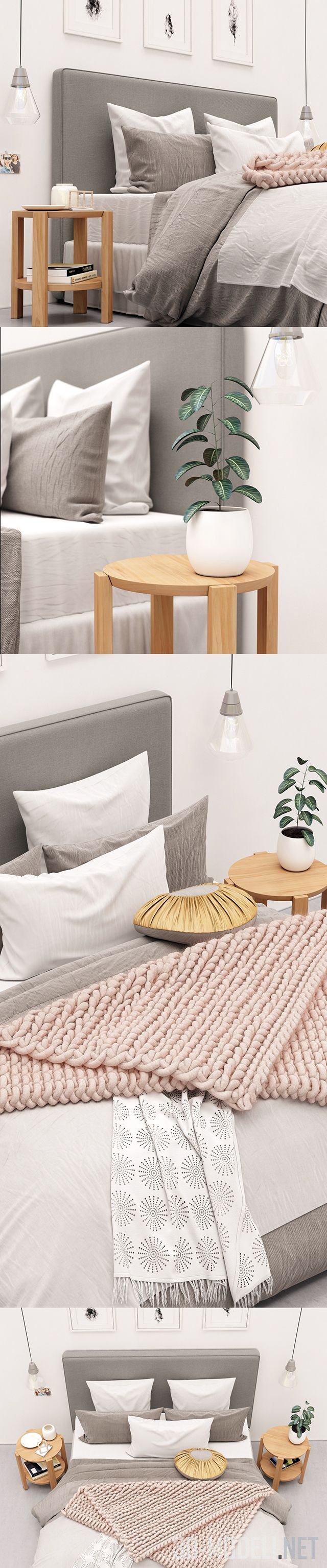 Поверх белого постельного белья лежит плед крупной вязки, нюдового оттенка. Возле кровати с обеих сторон под свисающими светильниками стоят два круглых деревянных столика с зеленым цветком на одном из них.
