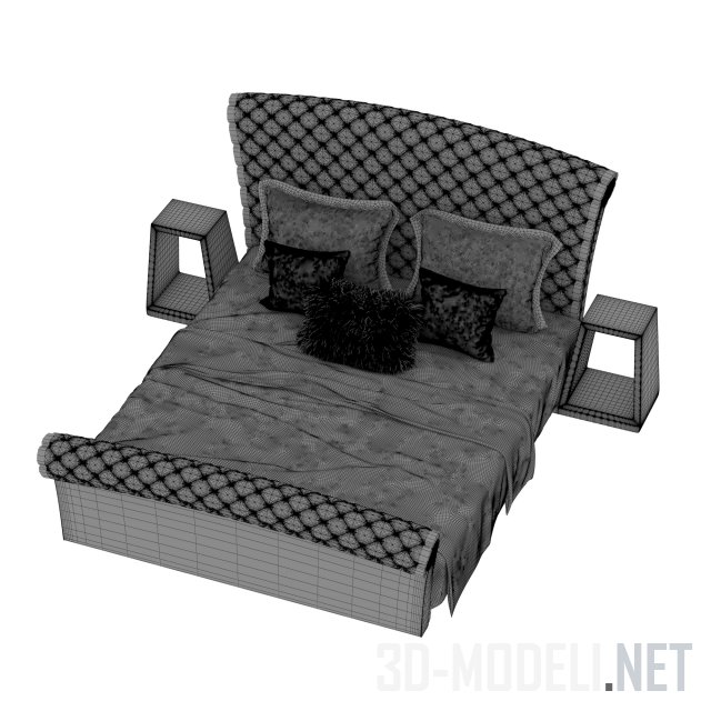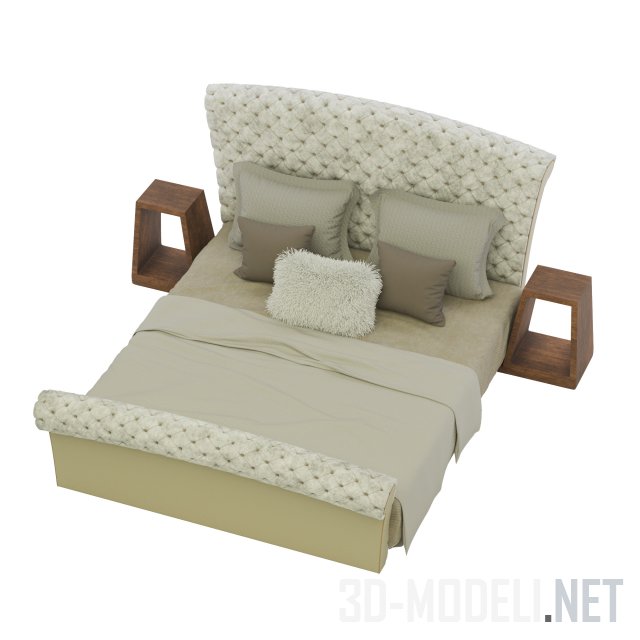 Двуспальная кровать Roll top с высоким изголовьем, закругленным вверху и таким закругленным изножием, обтянутыми светло-бежевым бархатом с декоративной простежкой и капитоне и пуговицами на пересечениях строчки. Возле кровати стоят тумбочки коричневого цвета в форме полой трапеции.