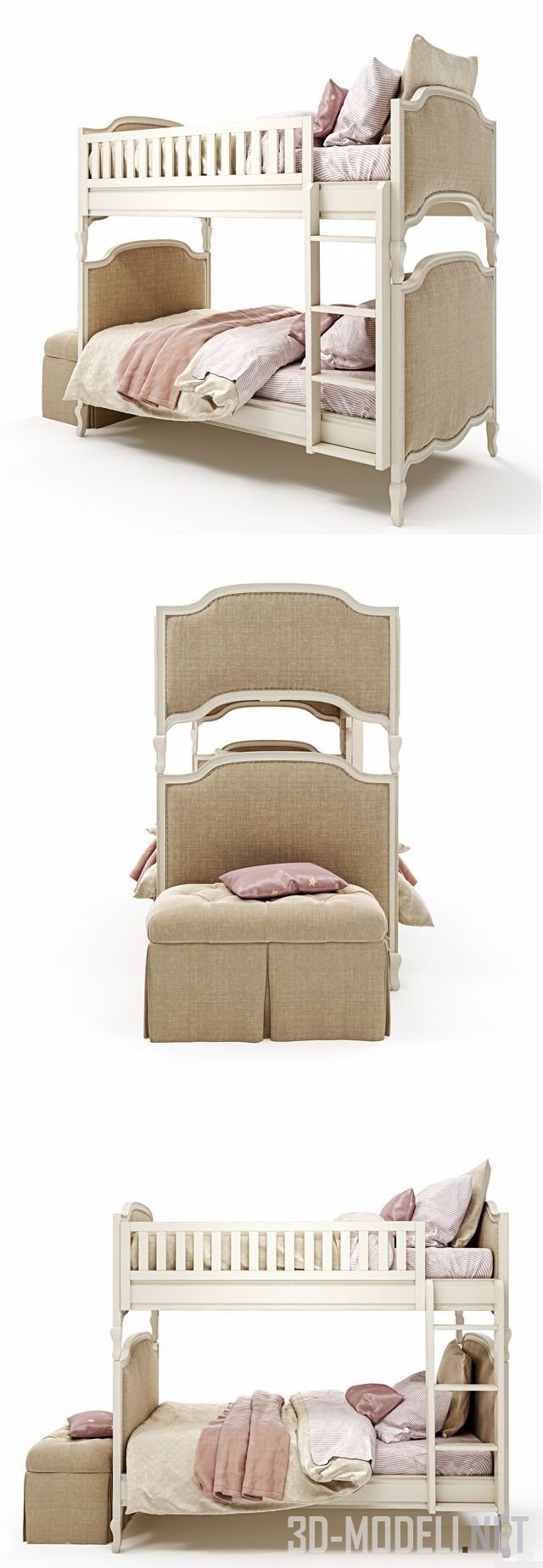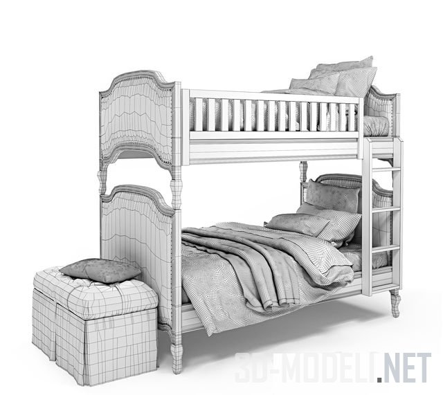 Набор мебели Marceline от Restoration Hardware. В комплекте двухъярусная детская кровать из белого дерева с фигурными ножками и бежевым и розовым постельным бельем , а также банкетка с емкостью для хранения вещей, обтянутая бежевым текстилем. Размер кровати: 185 x 113 x 203 см. Размер банкетки: 53 x 52 x 97 см.