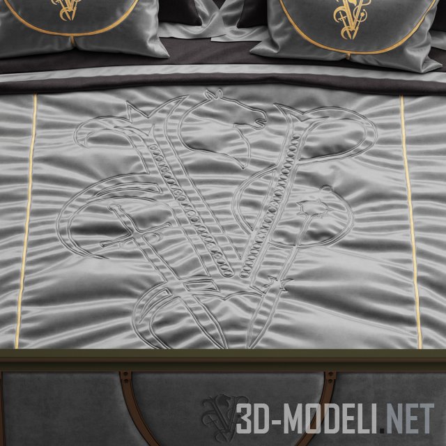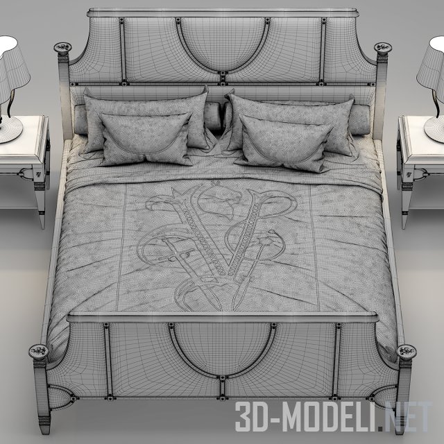 Двуспальная кровать Windsor master от итальянской фабрики Visionnaire. Выполнена в стиле арт-деко, с фигурными изголовьем и изножием, обтянутыми нубуком серого цвета и декорированными молдингом цвета меди. В изголовье кровати лежат серые шелковые подушки с золотым вензелем. С обеих сторон стоят белые тумбочки с настольными лампами.