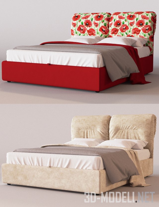 Несколько вариантов отделки кровати Sonberry Etnica: мягкая кожа шоколадного цвета, расписанная красными маками ткань и светло-бежевый, универсальный текстиль.