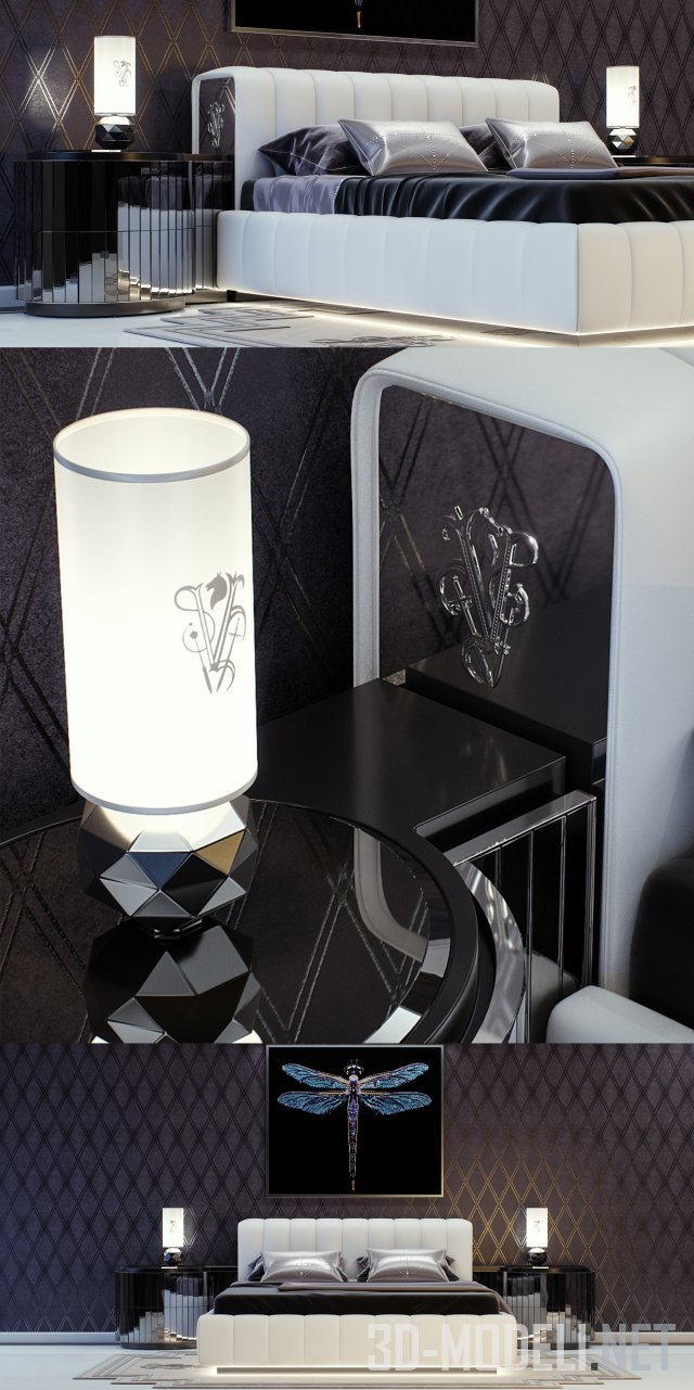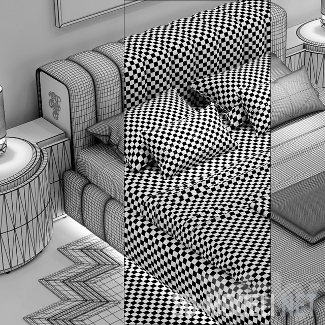 Двуспальная кровать Visionnaire Vaslav, имеет простеганное вертикально изголовье с фиксированной высотой. В комплекте прикроватные тумбочки, светильники, ковер.