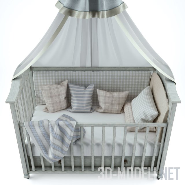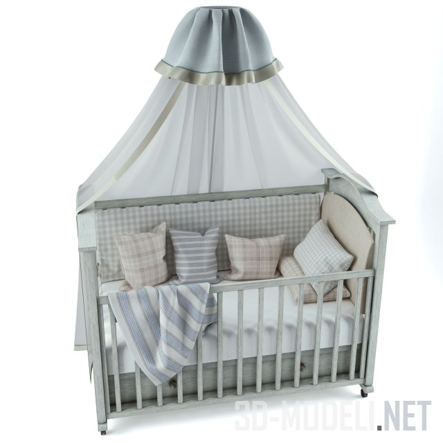 Детская колыбель в классическом исполнении, оборудована всем необходимым. Постельное белье выполнено в нежных оттенках, с текстилем в полоску и клетку, В нижней части кроватки предусмотрены удобные ящики. Колыбель оборудована колесиками и дополнена балдахином.