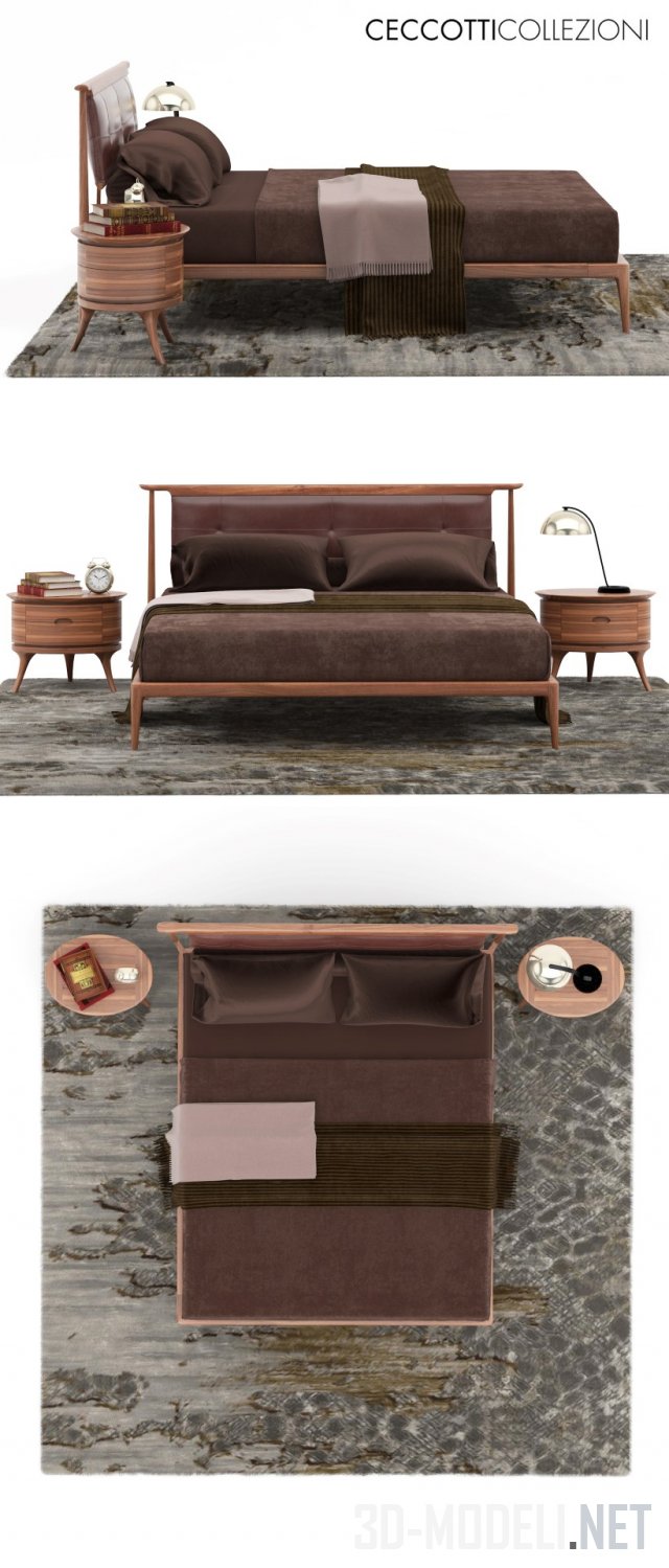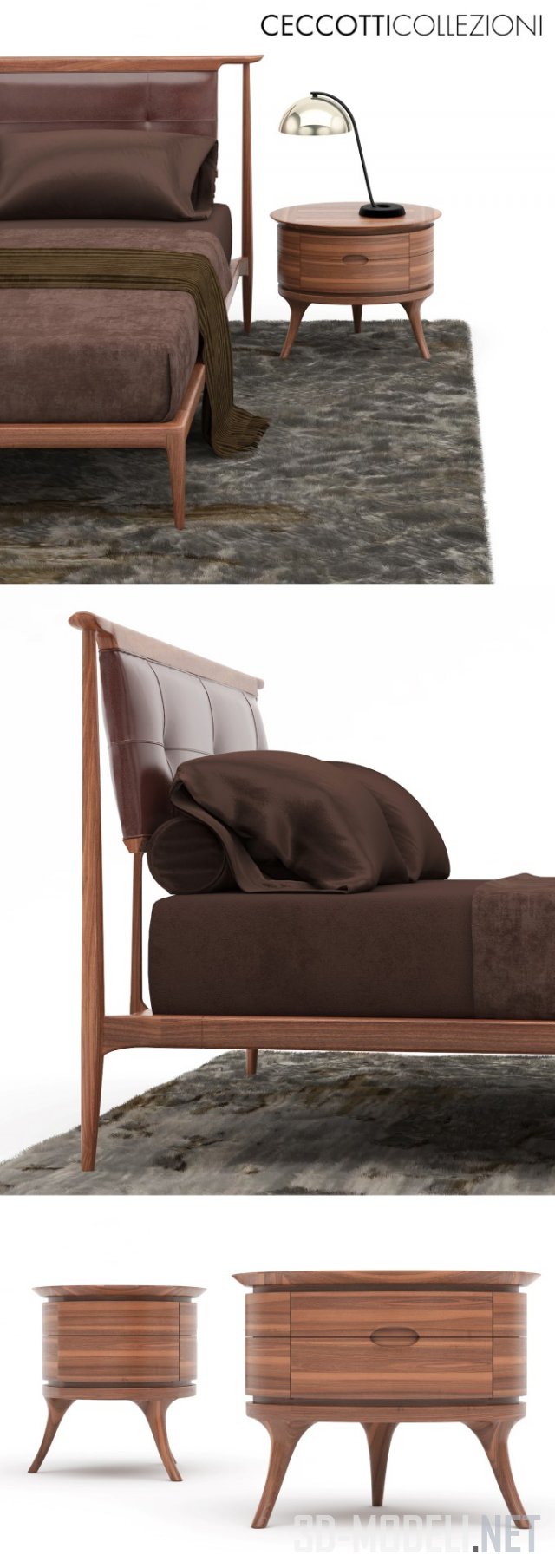 Современная кровать CECCOTTI DEMASIADO CORAZON итальянского производства. Кровать с мягким изголовьем из массива американского ореха. Основание кровати сделано из фанеры. Обивка изголовья выполнена из кожи красивого шоколадного цвета. Две круглые прикроватные тумбочки CECCOTTI AINDA с настольной лампой, книгами и будильником отлично дополняют набор.