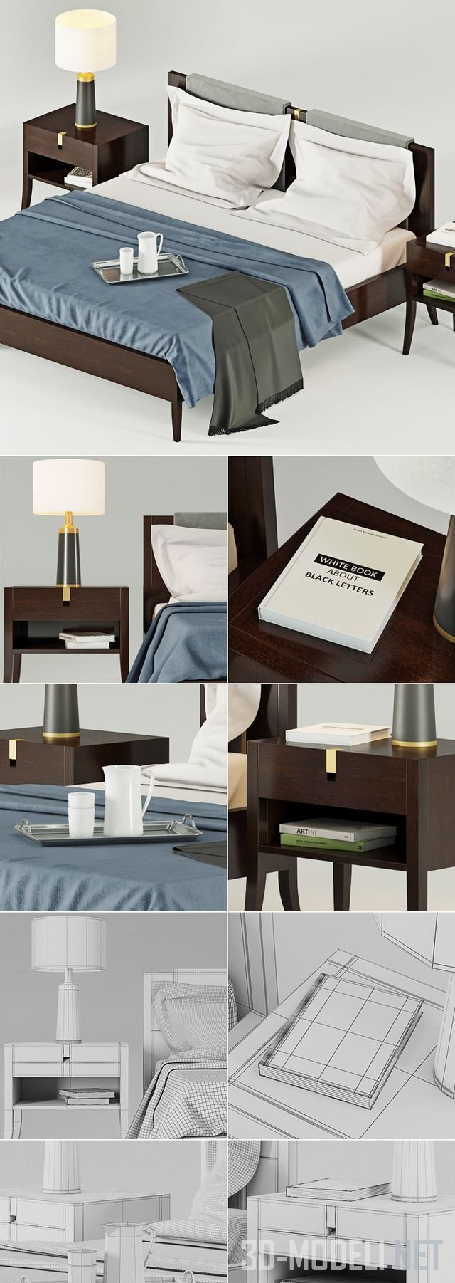 Набор современной мебели для спальни. Содержит двуспальную кровать Philipp Selva JUBILEE, прикроватный комод JUBILEE, настольную лампу SUMMIT, набор книг и скромный сервиз.