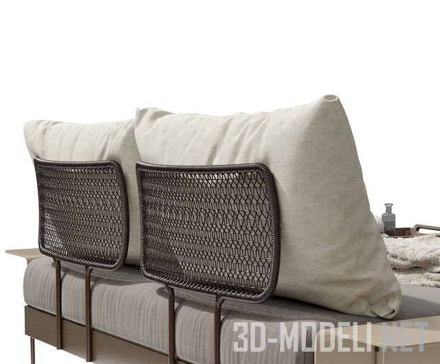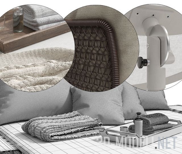Двуспальная кровать из коллекции Coral Reef 9805 от производителя Roberti Outdoor Pleasure. Размер 160 x 206 x 83h см. Кровать на алюминиевой раме с ножками из нержавеющей стали, отделана тканью Sunloom. На кровати лежат подушки и вязаный плед Zarahome. В изголовье стоит зонтик. Такая кровать идеально подходит для интерьера зоны бассейна, СПА и различных оздоровительных зон.