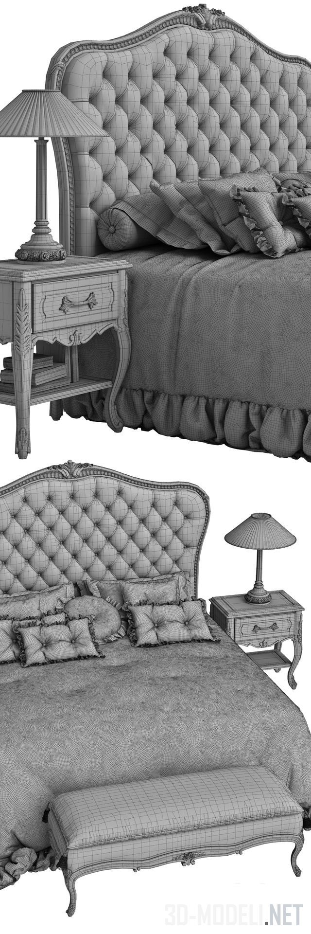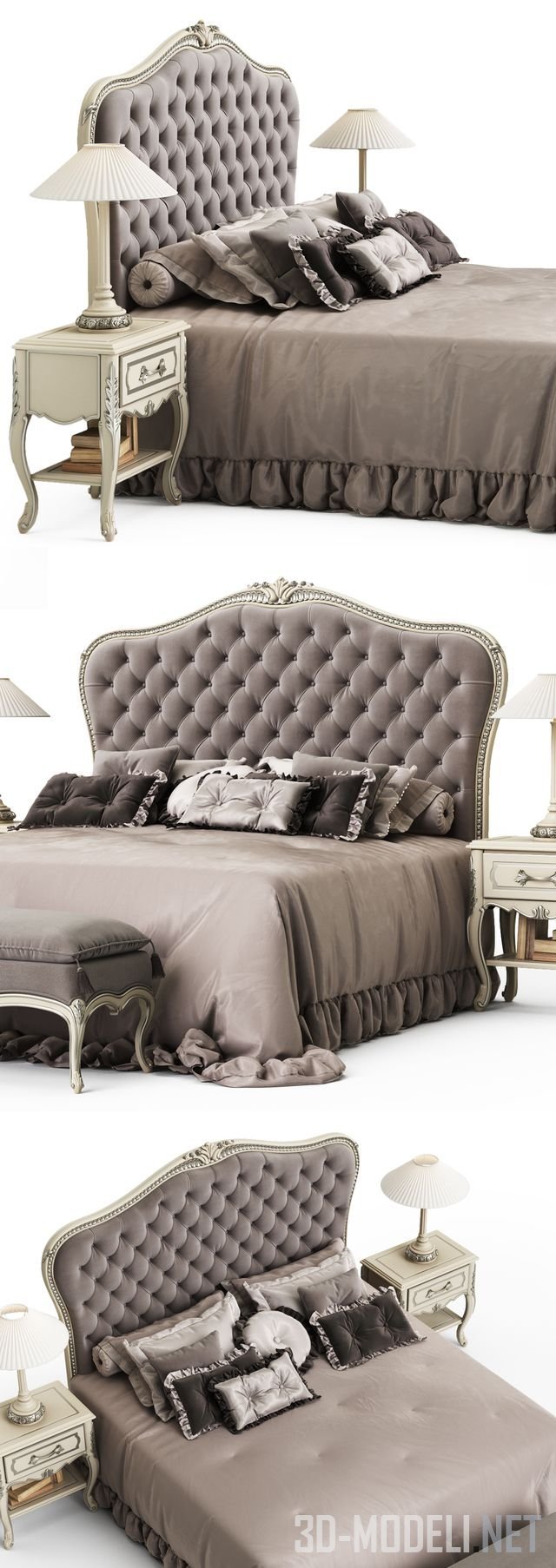Двуспальная кровать арт. 3141 от итальянского производителя Savio Firmino. Для спальни в классическом стиле. Кровать имеет высокое фигурное изголовье, обтянутое серым велюром и отделанное декоративной прострочкой капитоне. Размер кровати 200 x 210 x 179 H. Возле кровати с двух сторон стоят белые тумбочки (арт. 3173), с платиновой резной инкрустацией и гнутыми ножками (размер тумбы 59 x 40 x 65H). На тумбочках стоят настольные лампы арт. 2032, с конусообразными белыми абажурами размером 50 x 63H. Мягкая велюровая банкетка (арт. 3145) на белых гнутых ножках отлично дополняет набор. Размер банкетки 132 x 52 x 51H.
