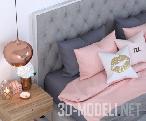 Выполненная в сочетании серого и розового оттенков, двуспальная кровать Prague. Стеганое высокое изголовье, разнообразие подушек и картина с абстрактным изображением отлично взаимодействуют в интерьере, а деревянные тумбы и подвесные светильники с медными абажурами вносят свою долю тепла и уюта в комплект. Качественная модель для различных проектов.