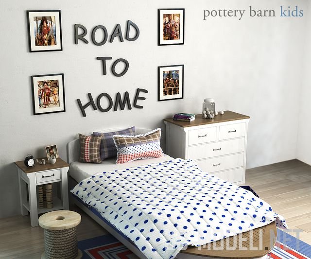 Комплект мебели от Pottery Barn для интерьера детской комнаты в морском стиле. На бело-сине-красном коврике стоит забавная кровать в форме скоростного катера. Тумбочка и комод белого цвета, сиденье в виде большой деревянной бобины с намотанным на нее канатом дополняют композицию.