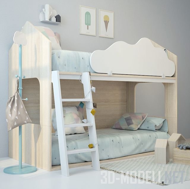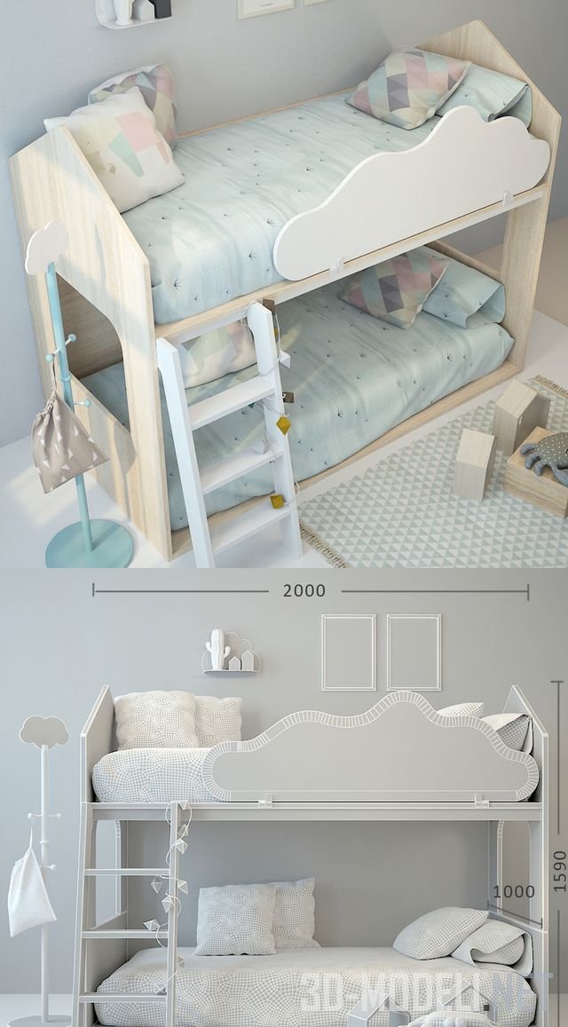 Детская двухъярусная кроватка Casita litera от бренда Kenay Home, изготовлена из светлого дерева. Кровать выполнена в виде домика. Размер кровати: 2000 x 1590h x 1000. Голубое с розовым постельное белье придает дополнительное уютное очарование.
