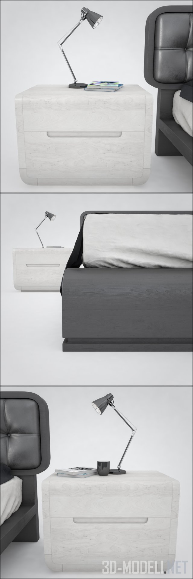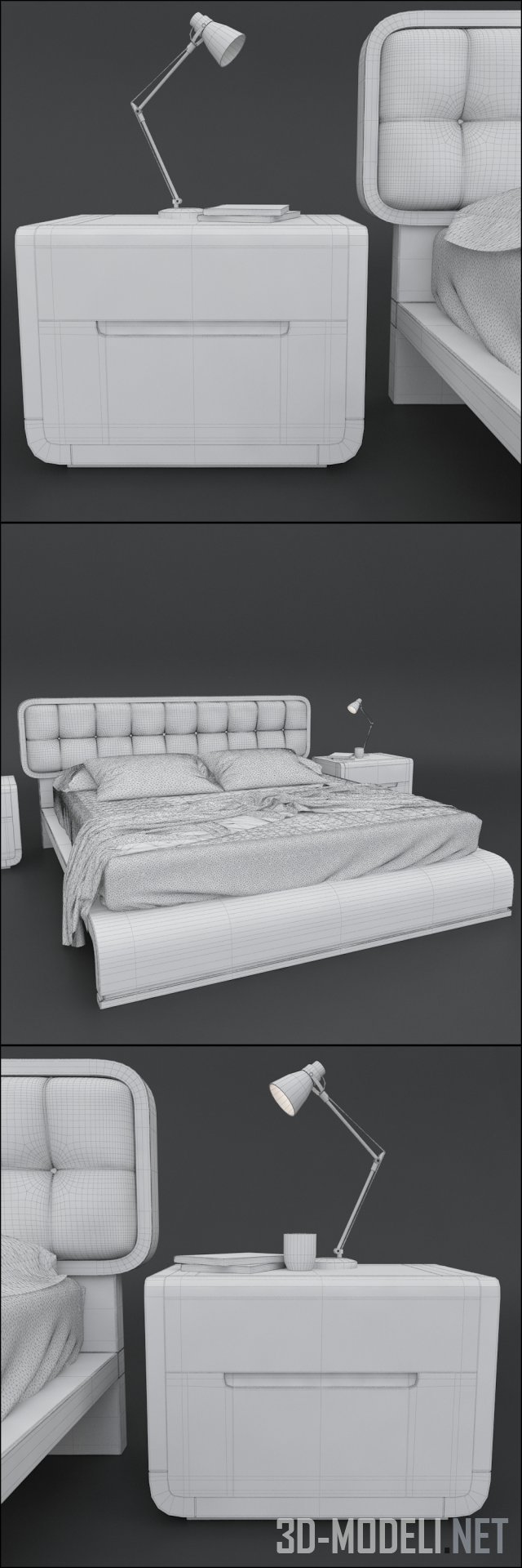 Спальный гарнитур от итальянской фабрики Benedetti mobili, с двухспальной кроватью Wadi letto из коллекции Dune. Невысокое изголовье с мягкой кожаной обивкой украшено стяжкой, разделяющей плоскость на два ряда квадратов. Линии изножья кровати и фасадов белых тумб перекликаются. А графитового цвета корпус и обивка кровати поддержана небольшими современными светильниками на тумбах, пледом и чехлами подушек. Габарит кровати: 183 x 217 x h97 см.