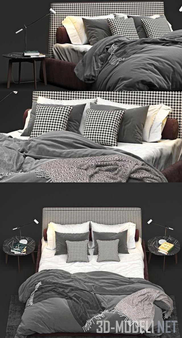 Тканевая двухспальная кровать Twils Byron производства Италия. Кровать с мягким изголовьем в современном стиле. Изголовье обтянуто тканью в мелкую черно-белую клетку, что в сочетании с двумя такими же подушками и мягким серым одеялом и белой простыней придает кровати очень уютный вид. На круглых прикроватных столиках стоят настольные лампы EGLO 57903. Размеры кровати: ширина 180 см, глубина 226 см, высота 105 см.