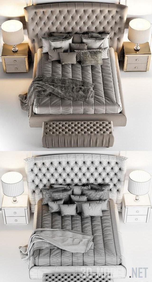 Комплект мебели в спальню от итальянского производителя DV homecollection. Двуспальная кровать из массива дерева и многослойного покрытия из недеформируемого пенополиуретана. Высокое изголовье обтянуто текстилем цвета какао с молоком, с простежкой капитоне. На кровати множество подушек и меховой плед серебристо-серого цвета. Размеры кровати: 2360 x 2300 x h1520 мм.