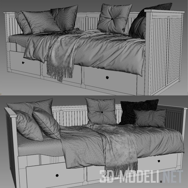Симпатичный комбинированный диван HEMNES от IKEA, белого цвета. Диван с подушками, пледами и синим матрасом в белый горошек. Это диван, односпальная кровать, двуспальная кровать и место для хранения в одном предмете мебели! Идеально для интерьера небольшой комнаты. Размер кровати: 209 x 89 x 83 см.