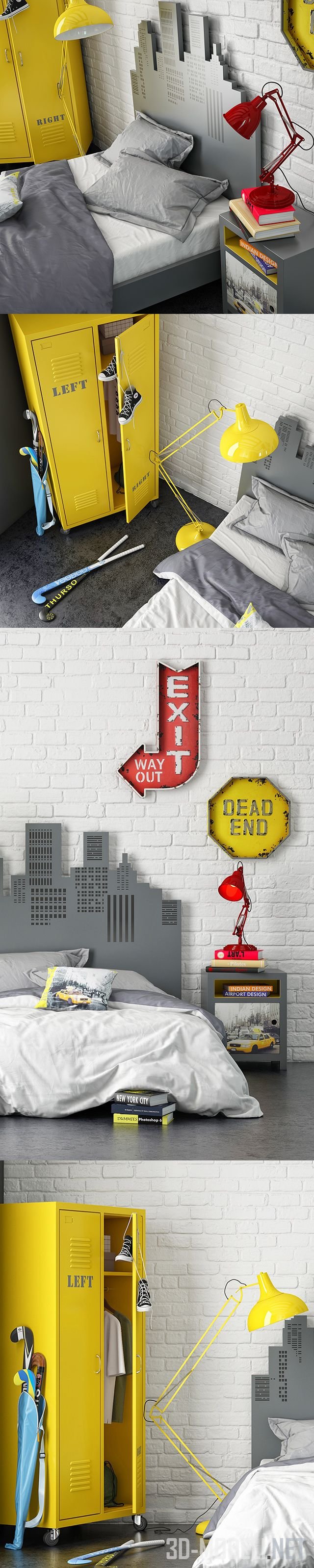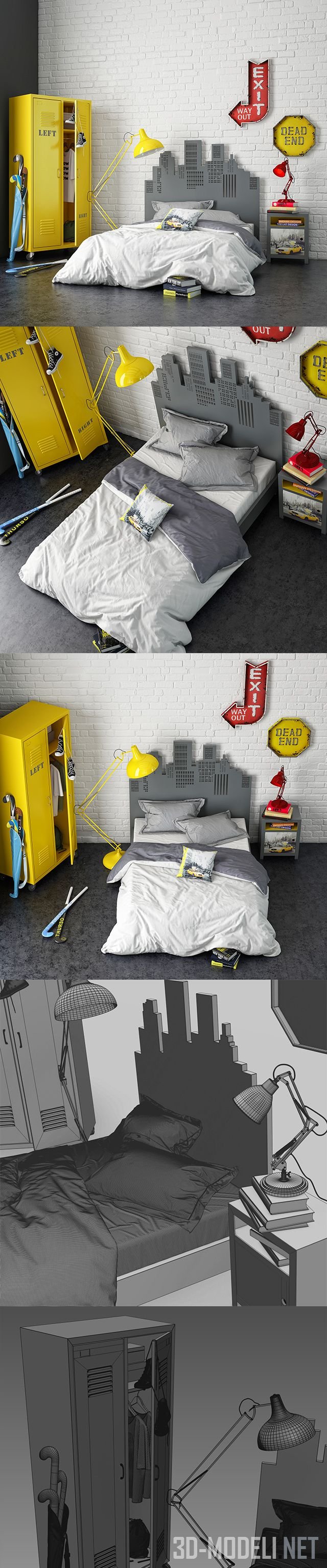 Сет для современной детской, в основе которого кровать JUNIOR от MAISONS DU MONDE. Размеры кровати: 190 x 140 см. Изголовье в виде небоскребов создает стильную и современную атмосферу и отлично сочетается другими предметами мебели и декора. Размер шкафа: 190 x 85 x 50 см, размер тумбочки: 55 x 45 x 33 см.