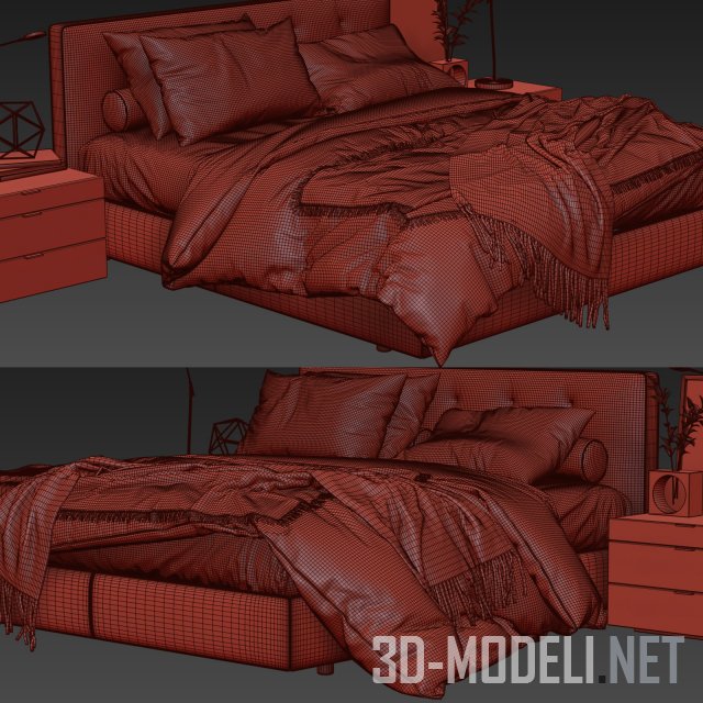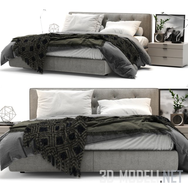 Двуспальная кровать Minotti Bedford производства Италия с мягким изголовьем. На кровати лежит белое постельное белье, пуховое одеяло и вязаный серо-черный плед. Рядом с кроватью стоит тумбочка из светлого дерева. Настольная лампа Oluce Lutz отлично гармонирует с другими предметами.