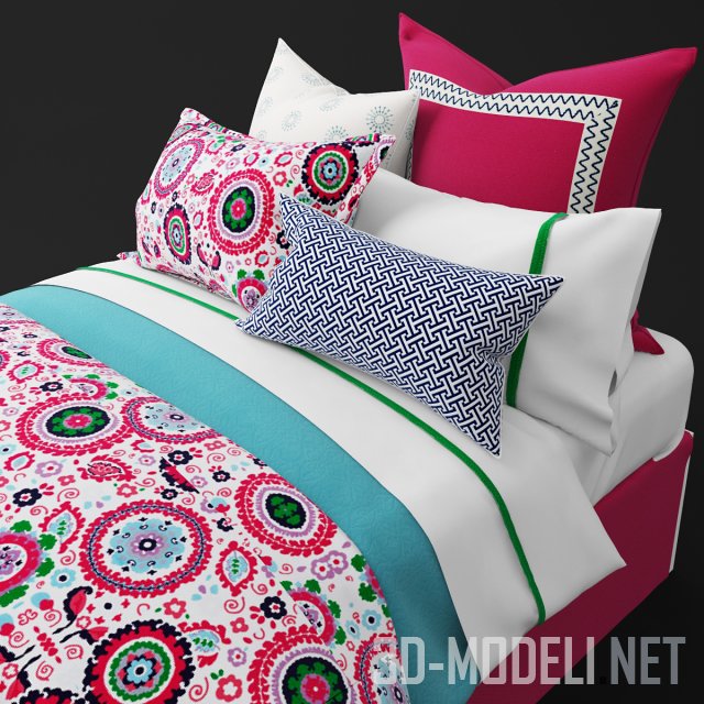 Набор яркого постельного белья для детской комнаты (отлично подойдет для девочки). В комплекте пять подушек, простыня, одеяло и покрывало.