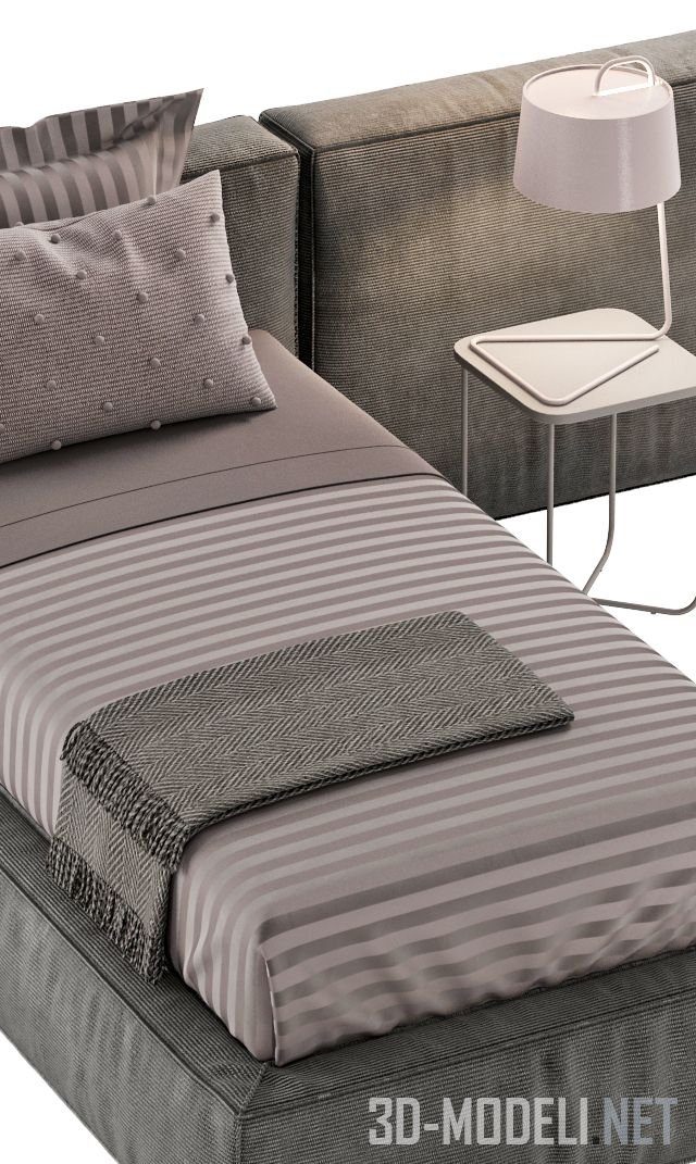 Односпальная кровать FLEXTEAM SLIM с большим мягким прямоугольным изголовьем и матрасом, лежащем на мягком подиуме. На кровати лежит постельное белье в цвете какао с молоком. Рядом с кроватью стоит небольшой прямоугольный столик NOVAMOBILI SISSI белого цвета с белой настольной лампой CALLIGARIS SEXTANS.