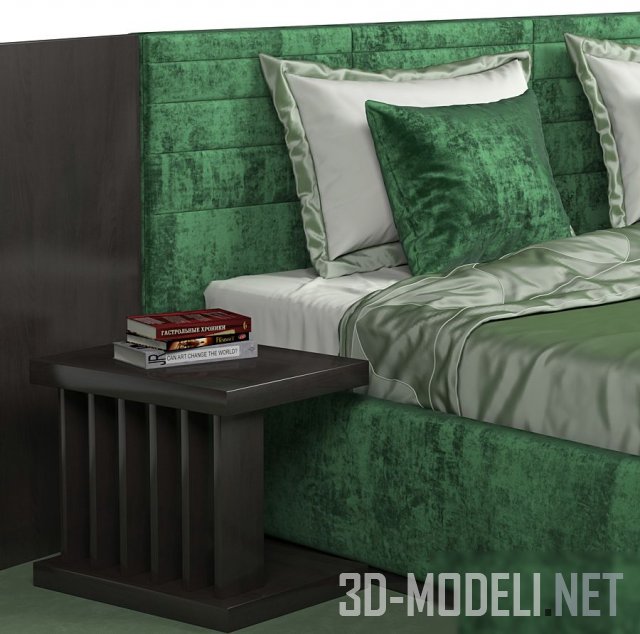 Двуспальная кровать Ditre Italia Grandangolo. Изумрудная обивка кровати отлично гармонирует с темным деревом прикроватного столика, а также постельным бельем и подушками. Реечное основание имеет размер 180 x 200, габариты кровати: длина 349 см, глубина 219 см, высота 101 см.