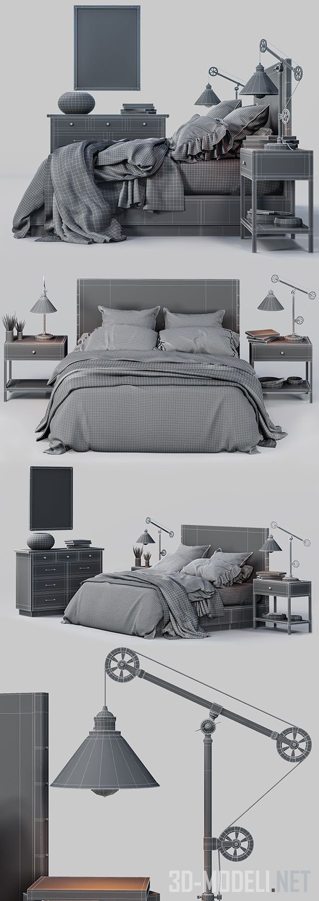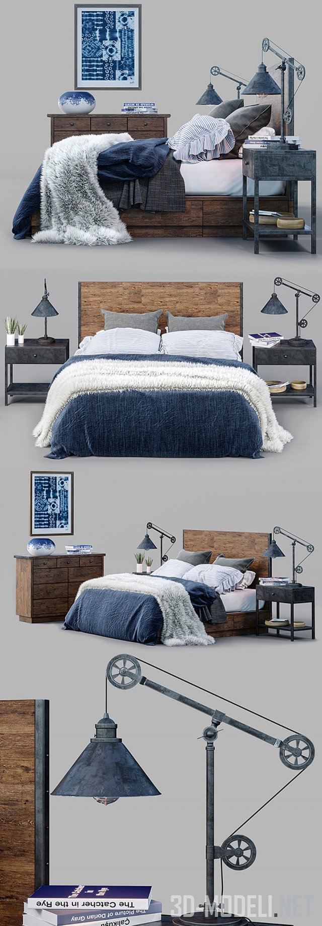 Набор мебели и аксессуаров от производителя Pottery Barn – модель Big Daddy's Antiques Bed Set. В комплекте настольная лампа Warren Pulley Task, кровать из восстановленного дерева и комод, арт-работа в рамке Shibori Textile Art.