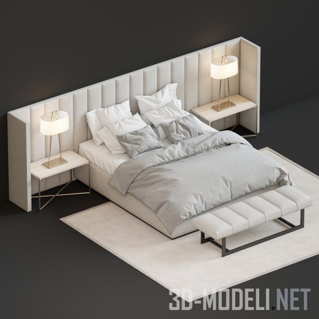 Спальная мебель Provence от бренда The Sofa and Chair Company. Кровать с большим белым мягким изголовьем, которое отделано декоративной вертикальной строчкой. По обеим сторонам кровати стоят два маленьких столика Lunar из светлого дерева, с золотистыми металлическими ножками. На столиках стоят настольные лампы Monocle с белыми абажурами. В наборе присутствует мягкая прямоугольная банкетка Constable, белого цвета с коричневыми ножками.