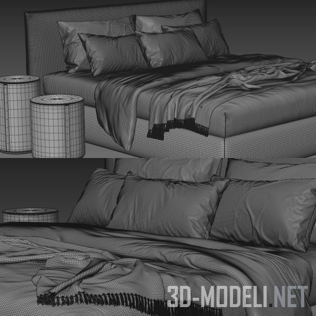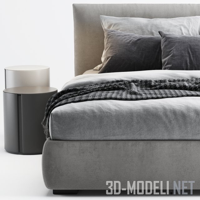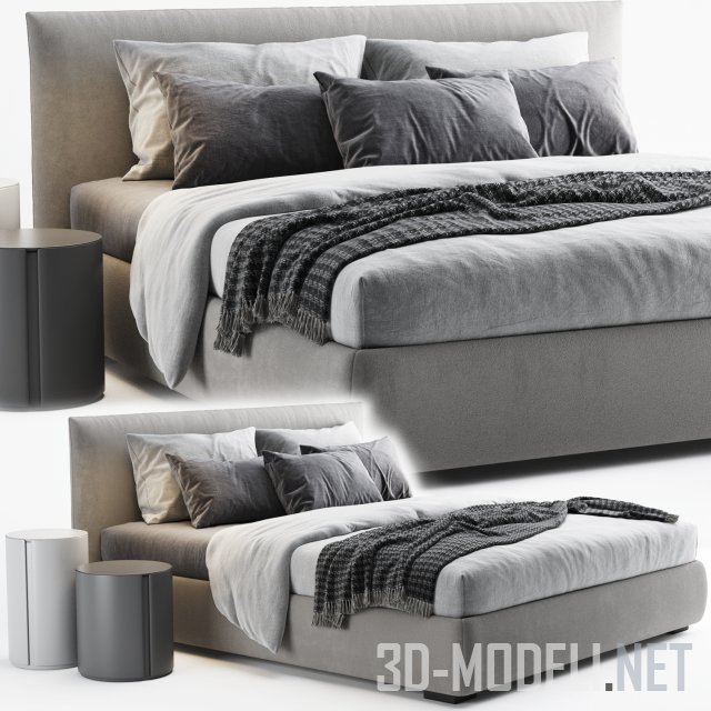 Двуспальная кровать от бренда Meridiani, серия Scott (дизайн Andrea Parisio). Кровать с мягким изголовьем кофейного цвета. На поверхности лежит белое и темное постельное белье и клетчатый плед с бахромой. Присутствуют прикроватные тумбочки.