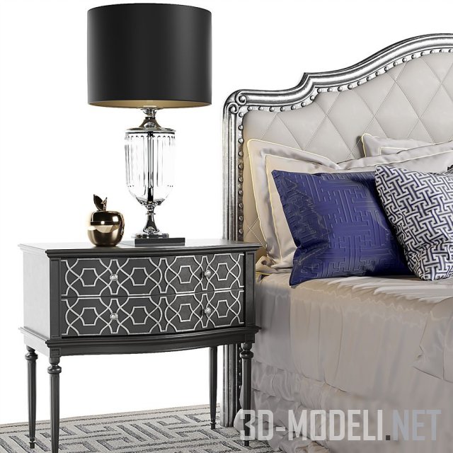 Набор для элегантной спальни. В основе гарнитура двуспальная кровать Marge Carson Rivoli. В комплекте тумба FRATELLI RADICE SRL, настольная лампа MHLIVING DA0949, ковер Mansour modern Victoria Hagan и пуф Lorenza Bozzoli.