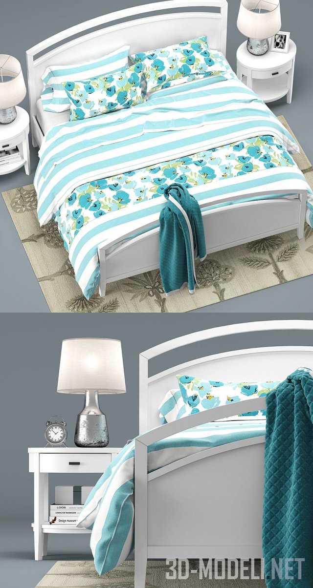 Красивая двуспальная кровать Arch White от производителя Crate&Barrel. Кровать белого цвета, с жестким изголовьем в виде арки. На кровати лежит бело-бирюзовое постельное белье. Бирюзовый банный халат, белые тумбочки с настольными лампами дополняют сет.