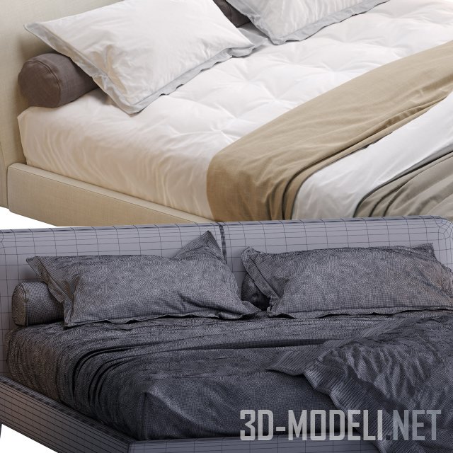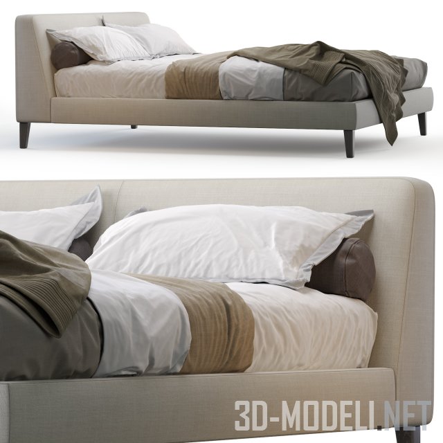 Двуспальная кровать Joe от бренда Jesse, имеет современный дизайн. Кровать отличает невысокое мягкое изголовье и маленькие деревянные ножки коричневого цвета. На кровати лежит постельное белье белого, бежевого и коричневого цвета.