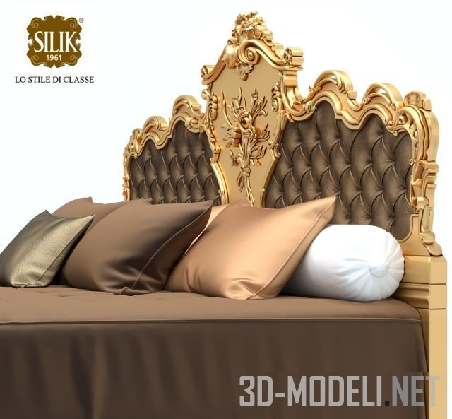 Двуспальная высокая кровать Venere от итальянской фабрики Silik (Silik King Size). Кровать поистине королевская, с высоким изголовьем, обтянутым коричневым шелком и простеганным прострочкой капитоне. Изголовье обрамлено золотой резьбой с большой золотой резной вставкой.
