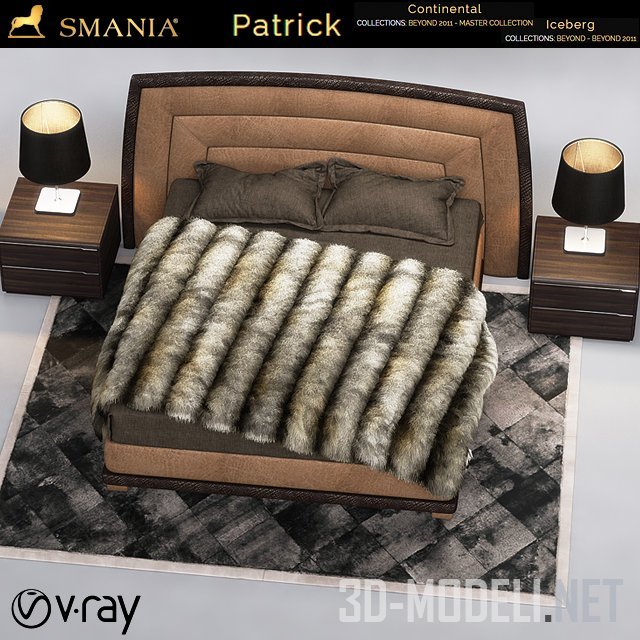 Двуспальная кровать Smania PATRICK в современном стиле. Ее каркас изготовлен из массива древесины. Изголовье обтянуто светло-коричневой кожей и декорировано строчкой. Изголовье и основание обрамлены деревянным элементом контрастного цвета. Кровать стоит на толстых коротких ножках и покрыта пледом из искусственного меха. Сет содержит: