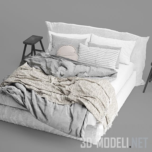 Простая белая кровать с прямоугольной спинкой. На кровати лежит постельное белье из натурального фактурного льна; подушки, простынь?, одеяло, плед белого и серого цвета. Льняное постельное белье Hale Mercantile Co. отличается качеством и функциональностью.
