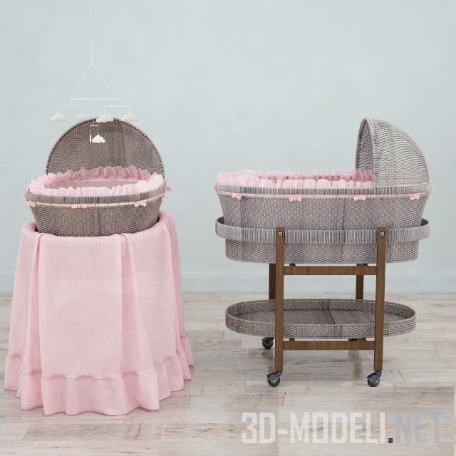 Колыбель от Restoration Hardware Baby & Child, сплетенная из искусственного ротанга, на мобильной деревянной раме с роликами. Нежно-розовые рюши в отделке периметра корзины и «юбка», прикрывающая нижнюю полку на раме. Над колыбелькой закреплен небольшой мобиль с маленькими облачками. Длина колыбели - 93см.