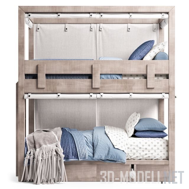 Двухярусная кровать для детей, модель Bennet от бренда Restoration Hardware. Основа из светлого дерева цвета какао с молоком. Синее, голубое и белое постельное белье хорошо смотрится вместе с бежевым пледом с длинными кистями. Размеры кровати: 2180х1180х2320 мм.